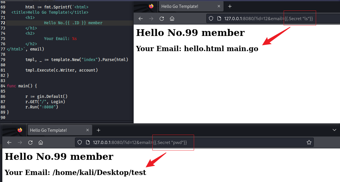 用Golang的模版编写有SSTI缺陷的代码,不仅仅可以做到获取敏感信息,还可以实现RCE。下面代码就存在SSTI的缺陷: