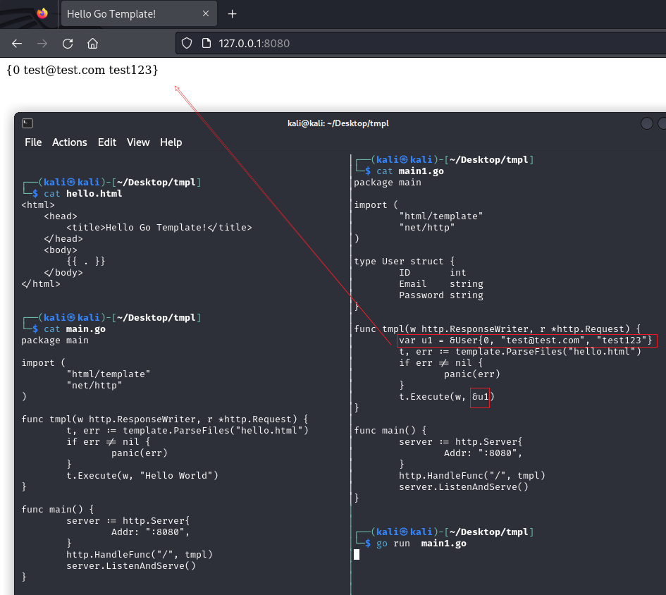 如果修改代码,加入一个User结构体,执行t.Execute(w, &u1):就会解析到u1 对象,即打印u1对象的所有值 {0 test@test.com test123}。如果html中的代码 {{ . }}修改为{{.Password}} 就会等同于执行了t.Execute(w, &u1.Password) ,浏览器上的HTML就会解析、渲染Password的值——test123 。如果如果html中的代码{{ . }}修改为{{.Pa}}:,那么就没有正确的值可以访问,浏览器上对应的地方就会出现空白,没有任何相关输出。
