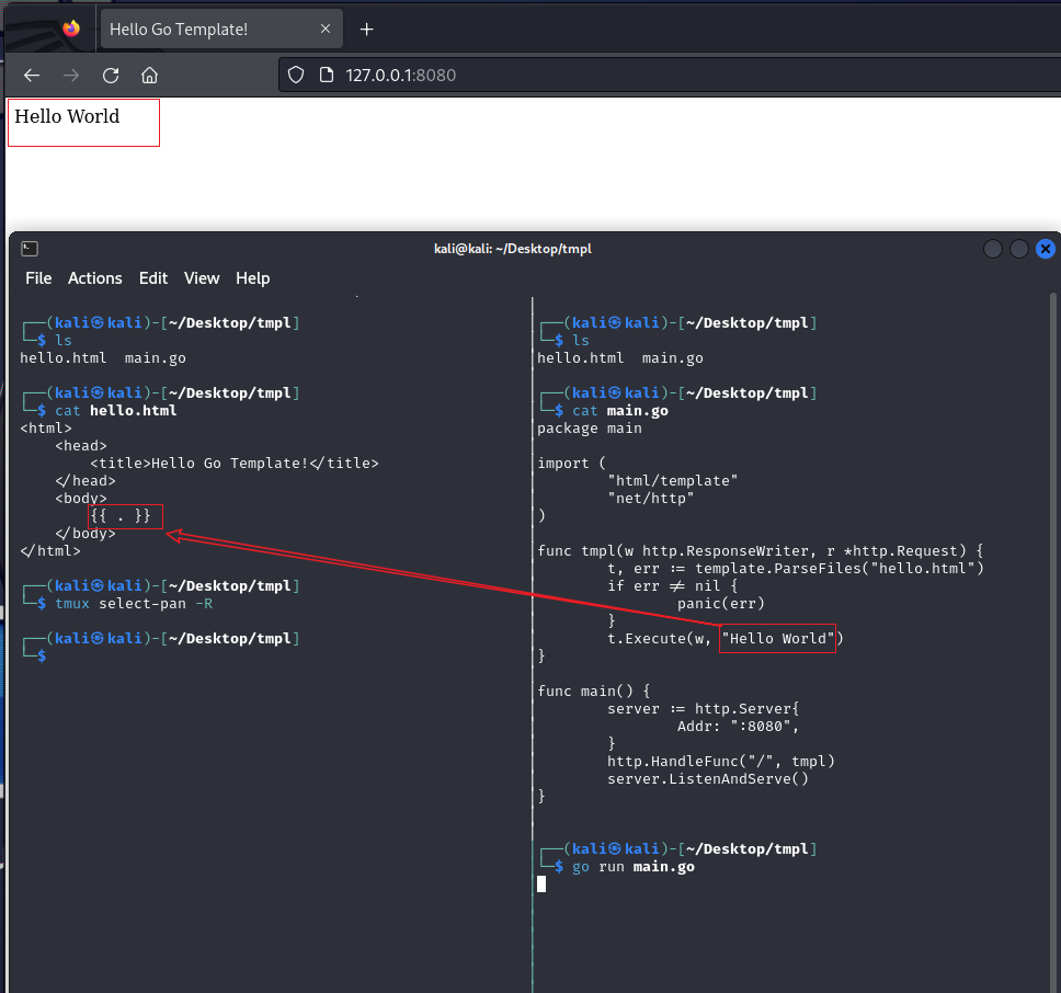 创建两个文件,一个为hello.html,一个为main.go,使用模板包处理渲染HTML。html文件中使用了template的语法{{.}},然后通过go的template引擎进行解析,替换成对应的内容——Hello World,所以浏览器渲染的是Hello World :