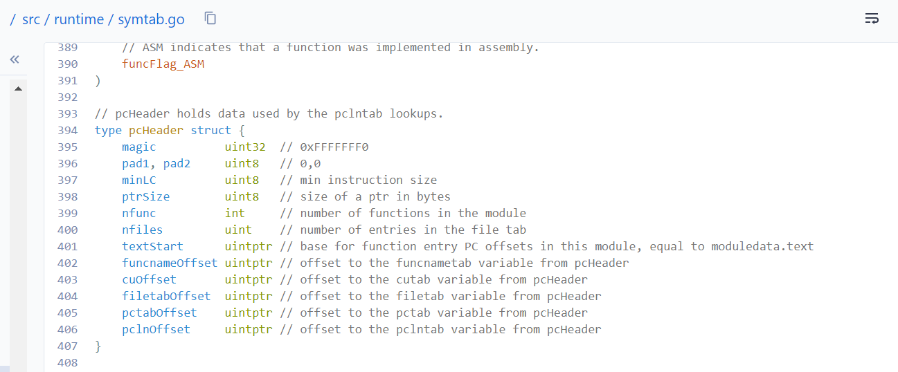 官方的代码库中src/runtime/symtab.go对pcHeader结构体的定义如下: