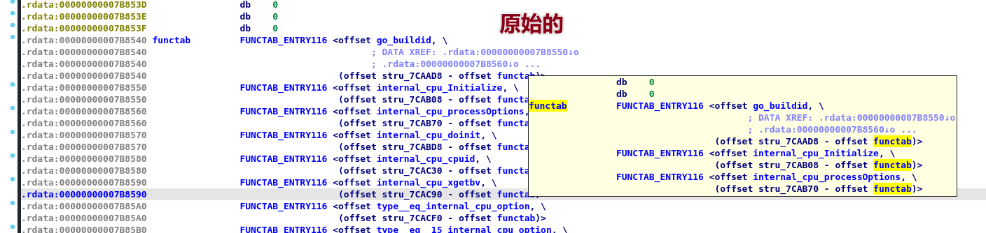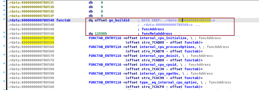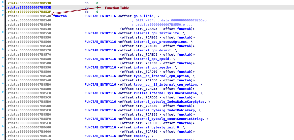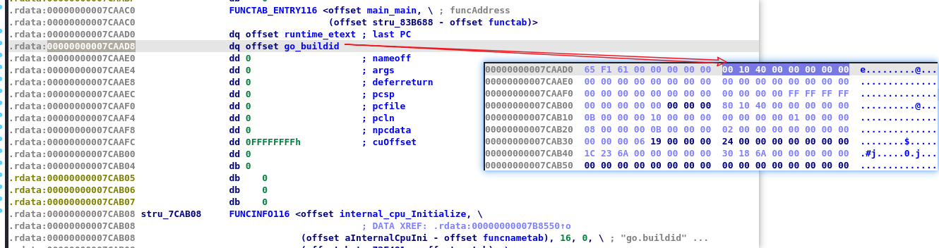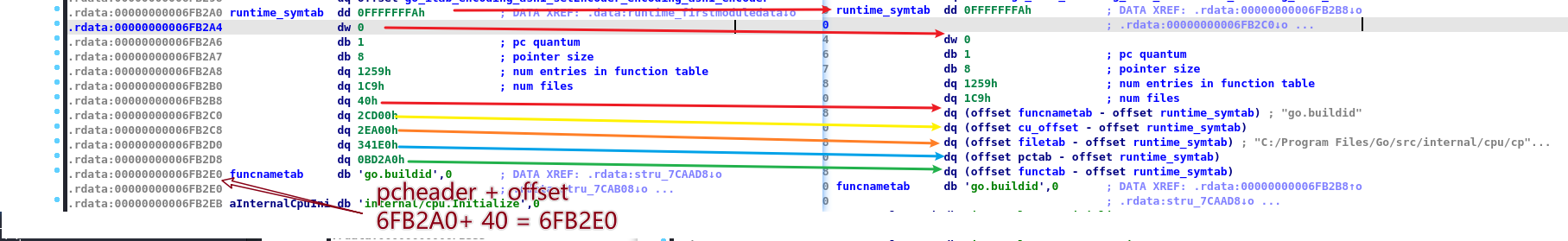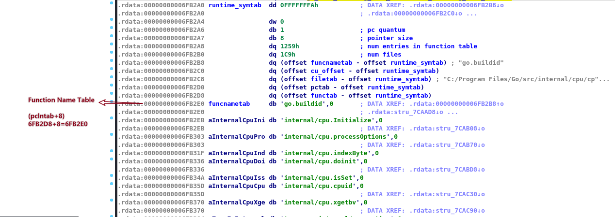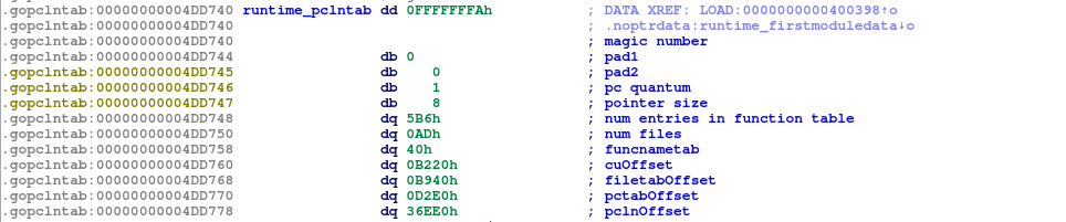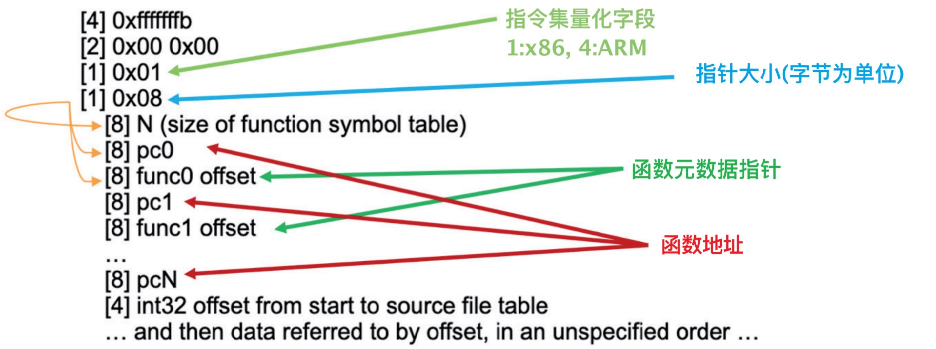 根据 https://docs.google.com/document/d/1lyPIbmsYbXnpNj57a261hgOYVpNRcgydurVQIyZOz_o/pub 描述可知,函数符号表、文件名表、函数结构体以及这些数据的偏移量引用的数据在内存中都是连续的,记录在pclntab( Program Counter Line Table,程序计数器行数映射表,也叫称为 Runtime Symbol Table) 上。该表将虚拟内存地址映射回最近的符号名称,用于生成带有函数和文件名的堆栈跟踪。所以在Golang程序的逆向工程中,pclntab对于恢复符号来说是很重要的一个切入点。