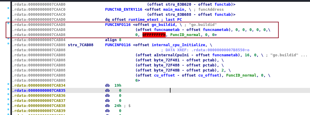 从Go1.18开始,在buildinfo的表中提供了附加元数据,其中涉及编译器、链接器标志、GOOS/GOARCH环境变量值、git信息、以及有关主包、依赖包的包名称信息。所以Golang二进制的元数据也很有意思,在分析场景中可能会涉及。