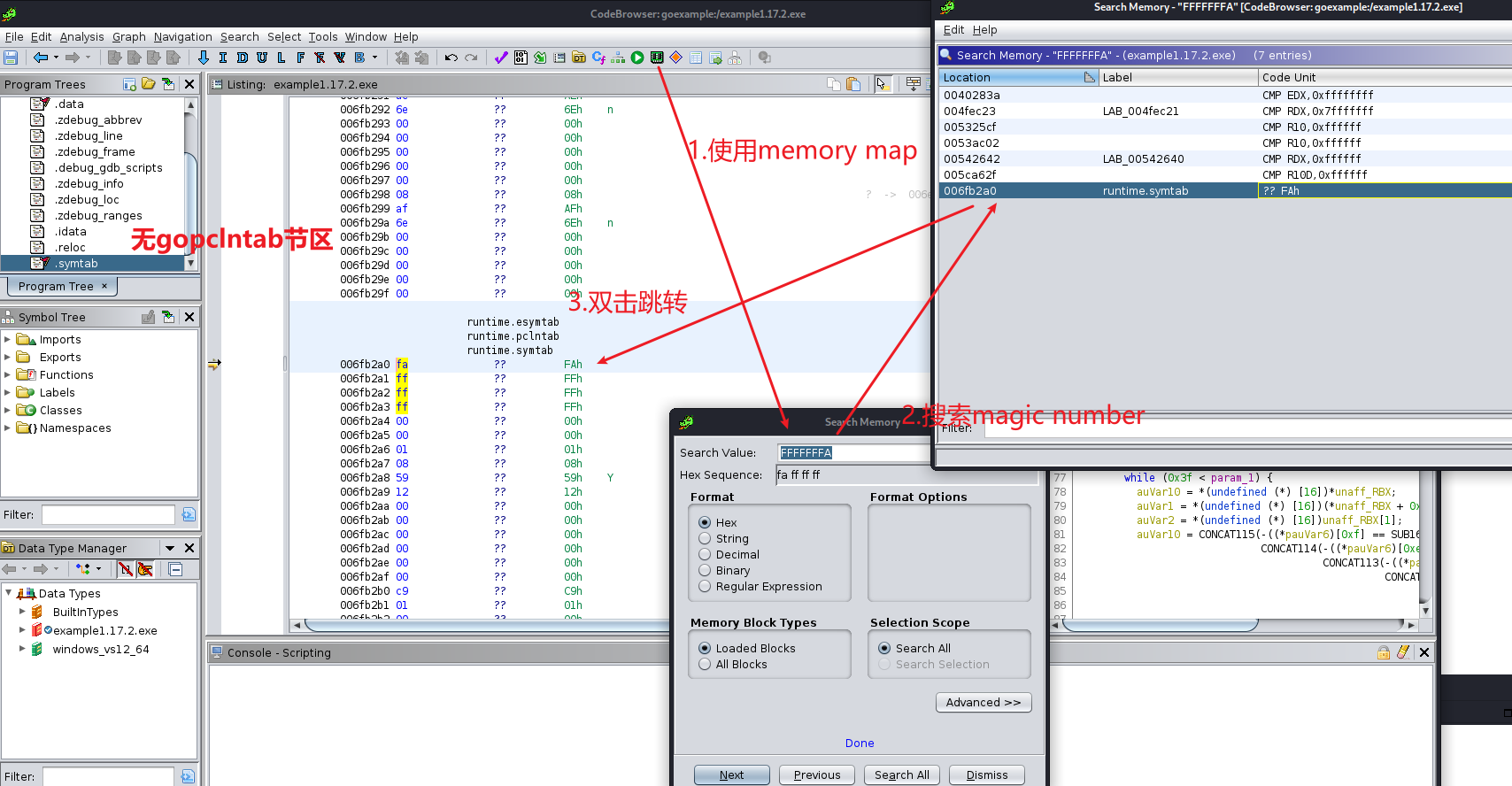 定位 pclntab 的方法:遍历查找magic值,从而确定pclntab的地址。然后遍历funcs表,得到func_struct,通过func_struct的name_offset字段获取函数名称,进而重命名函数。