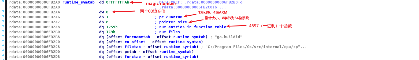 magic:pclntab的第一个字段是uint32的幻数值pad1, pad2:第二个字段是两个0x00填充值minLC:最小指令长度。在填充值后跟一个给出指令大小量程的字节值,1代表x86,4代表ARMptrSize:第四个字段是uintptr类型的指针大小。以字节为单位,32bit 的值为0x04,64 bit 的为0x08nfunc:模块中的函数数量